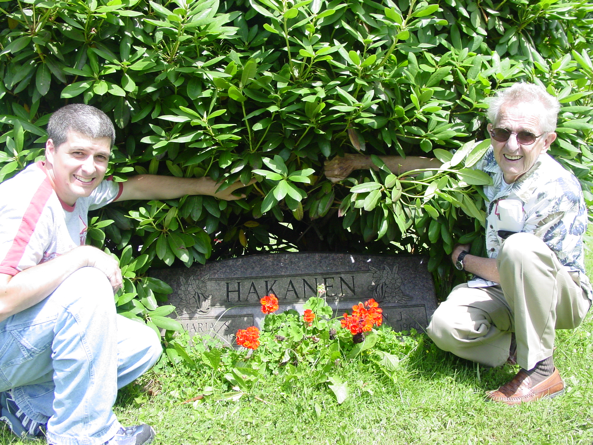 This is my youngest son, Erin and myself holding back the rhododendron that covers my grandparents grave. The Finnish cemetery is very near my grandparent''s home in the portion of Nanty-Glo known as "Finntown".